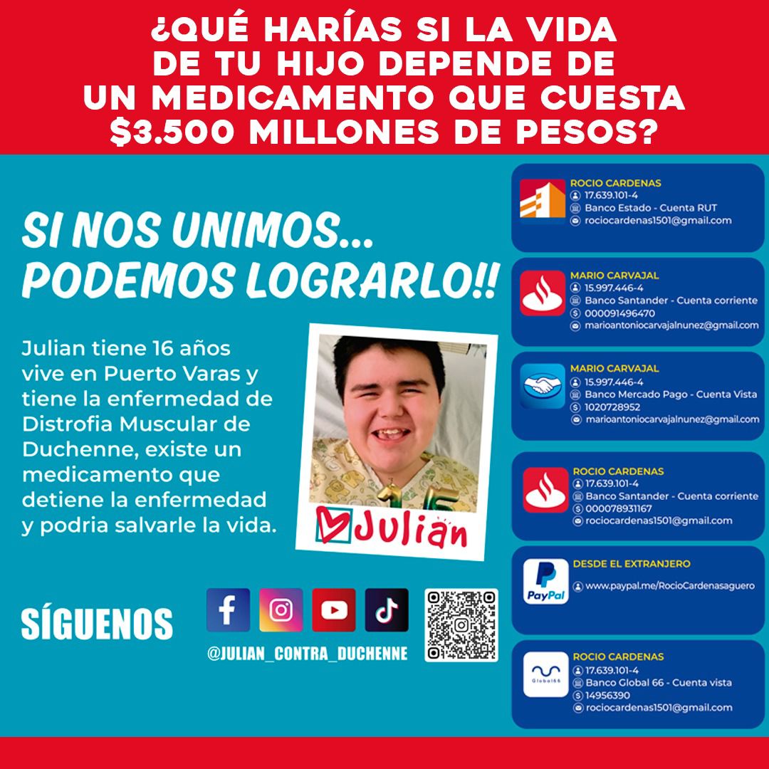 Que nos apoyen, que no lo dejen morir, Julián es el paciente más grande del país que necesita este fármaco. Él corre más peligro por su edad, por lo que debemos actuar rápido y sacarlo prontamente del país para poder revertir el desenlace fatal de esta patología. El caso conocido de Tomas Ross, él necesitaba el fármaco para no dejar de caminar y Julián lo necesita para poder seguir vivo. Ahí la diferencia.
